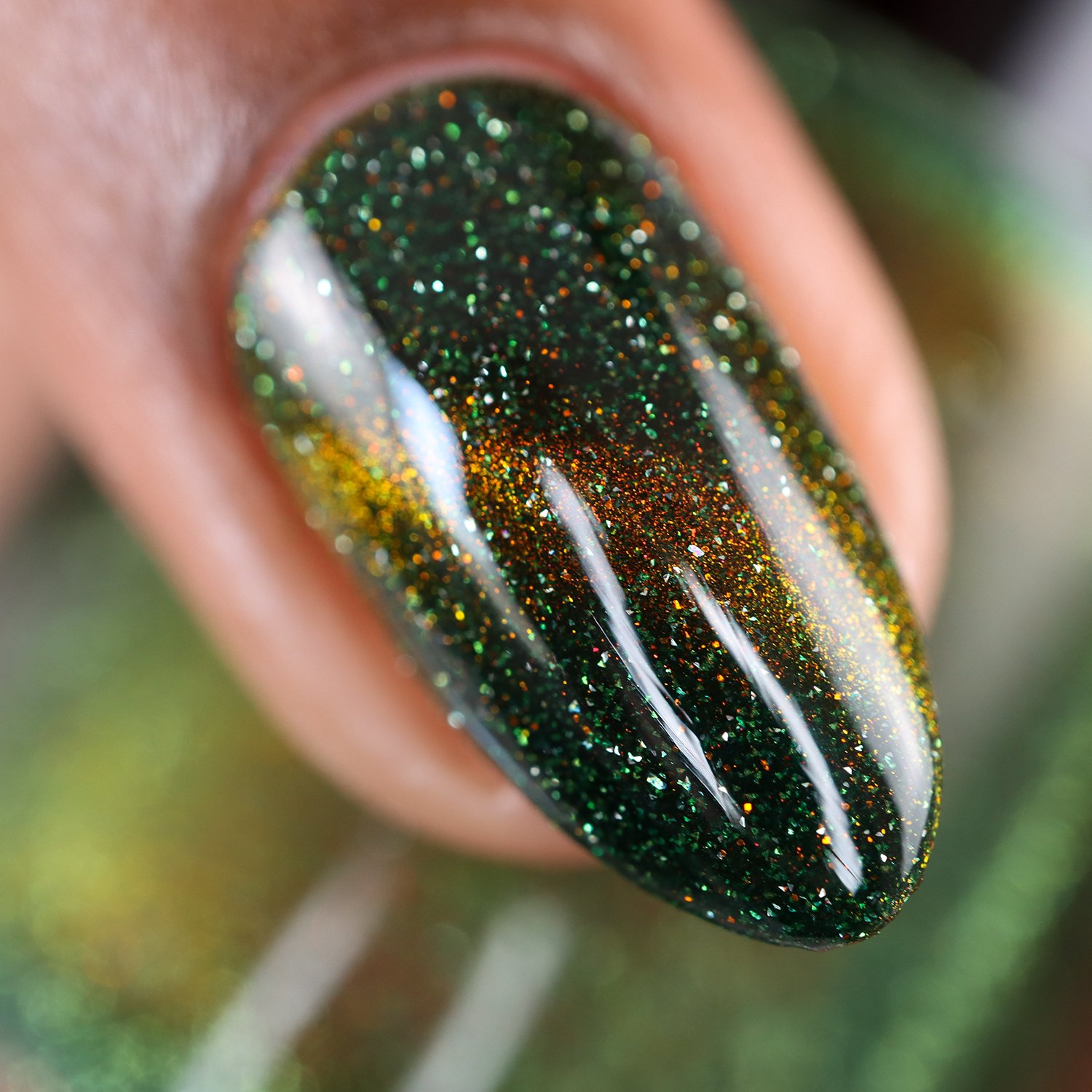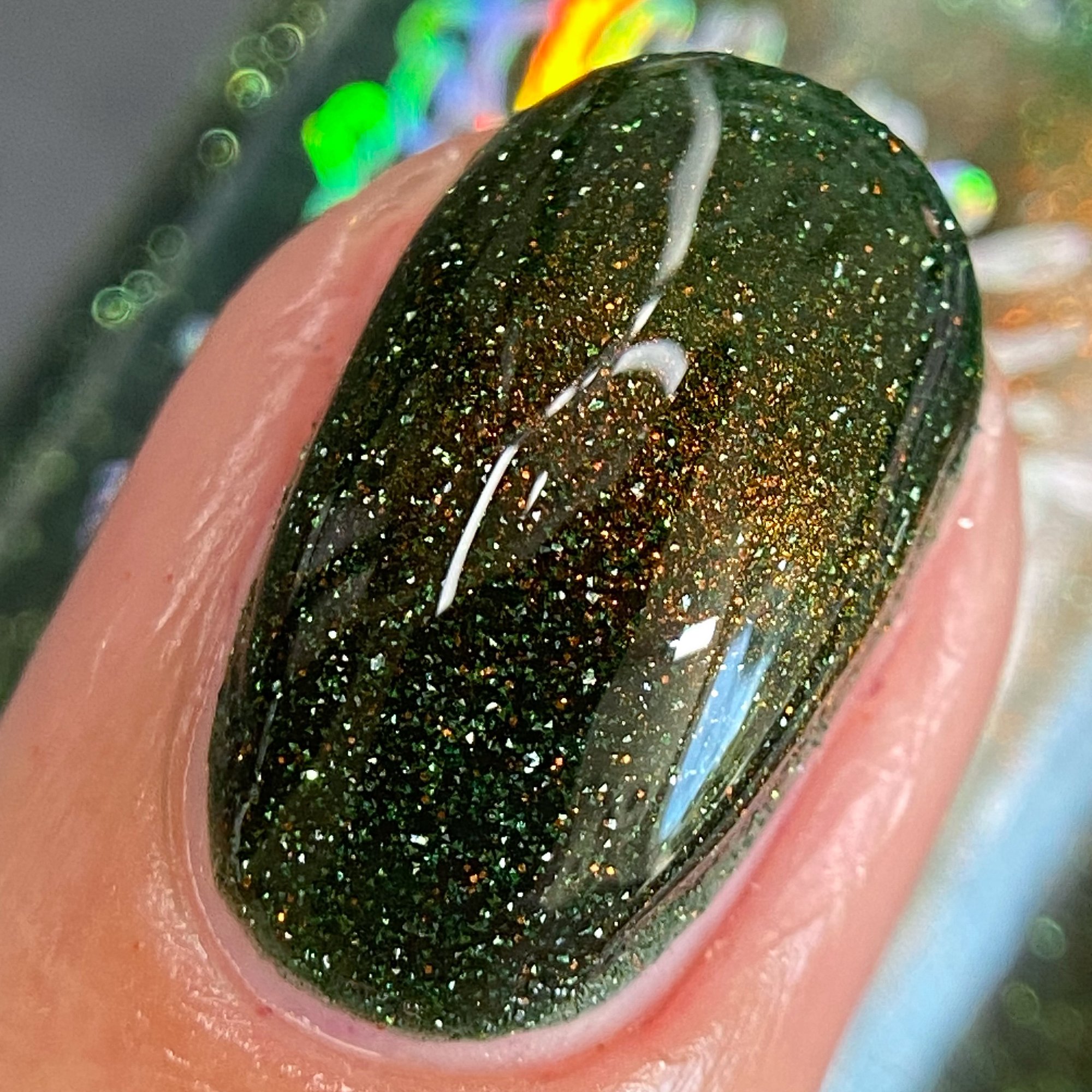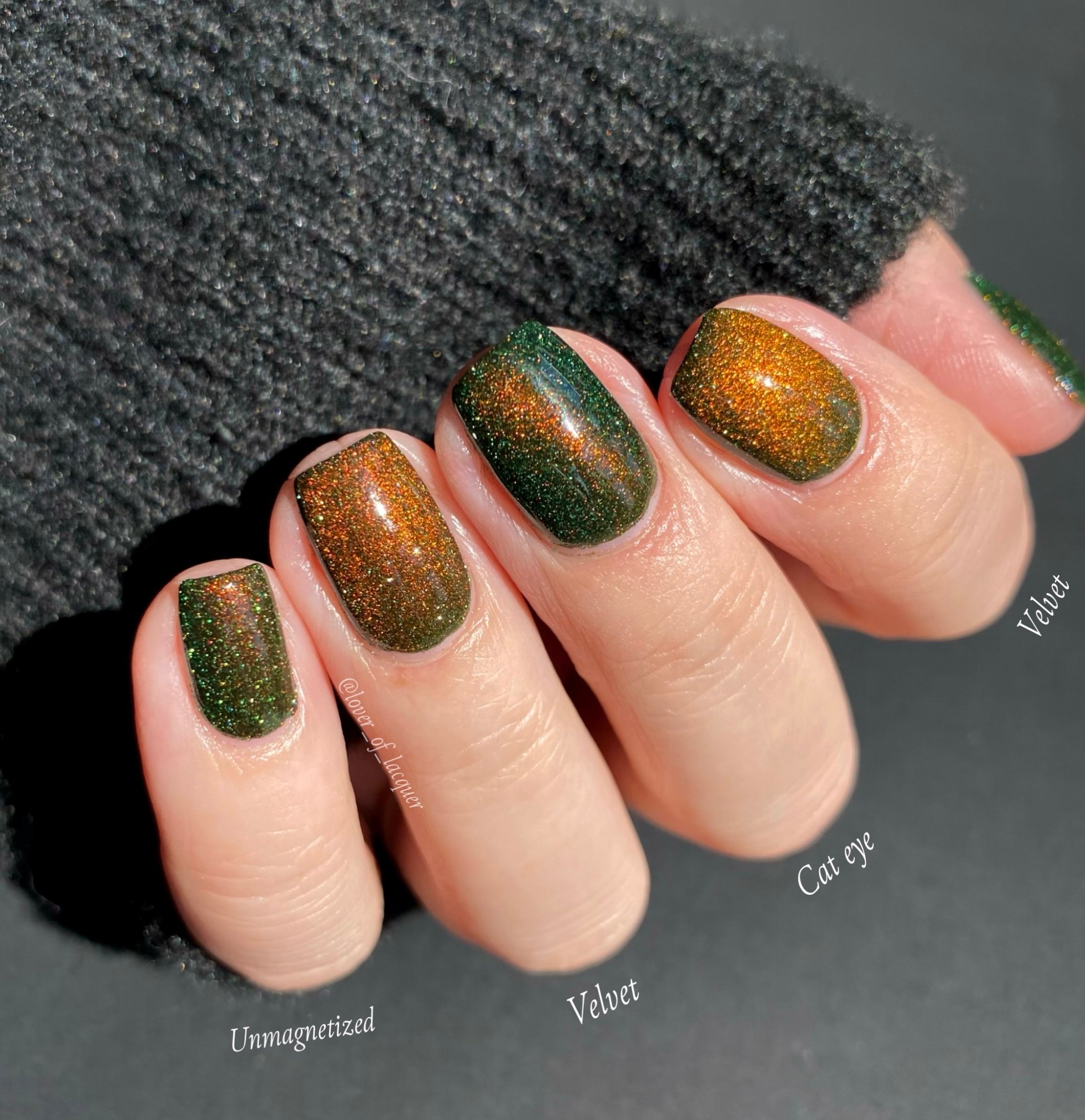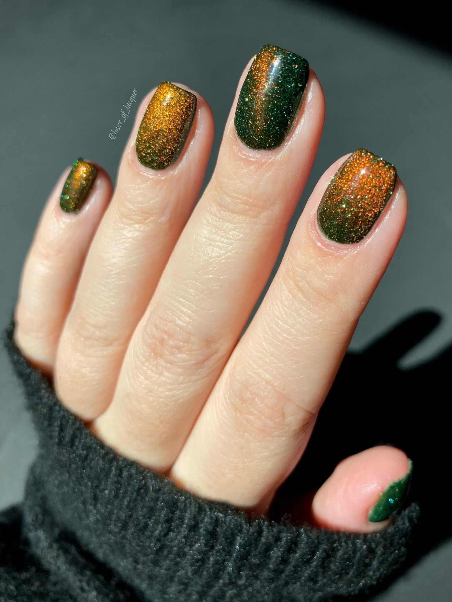 Greenwich Village is a deepened warm green with light green flash reflective micro glitter and orange/copper/gold magnetic shimmer. ** Polish is highly pigmented so just be sure to use base coat to prevent staining! **
