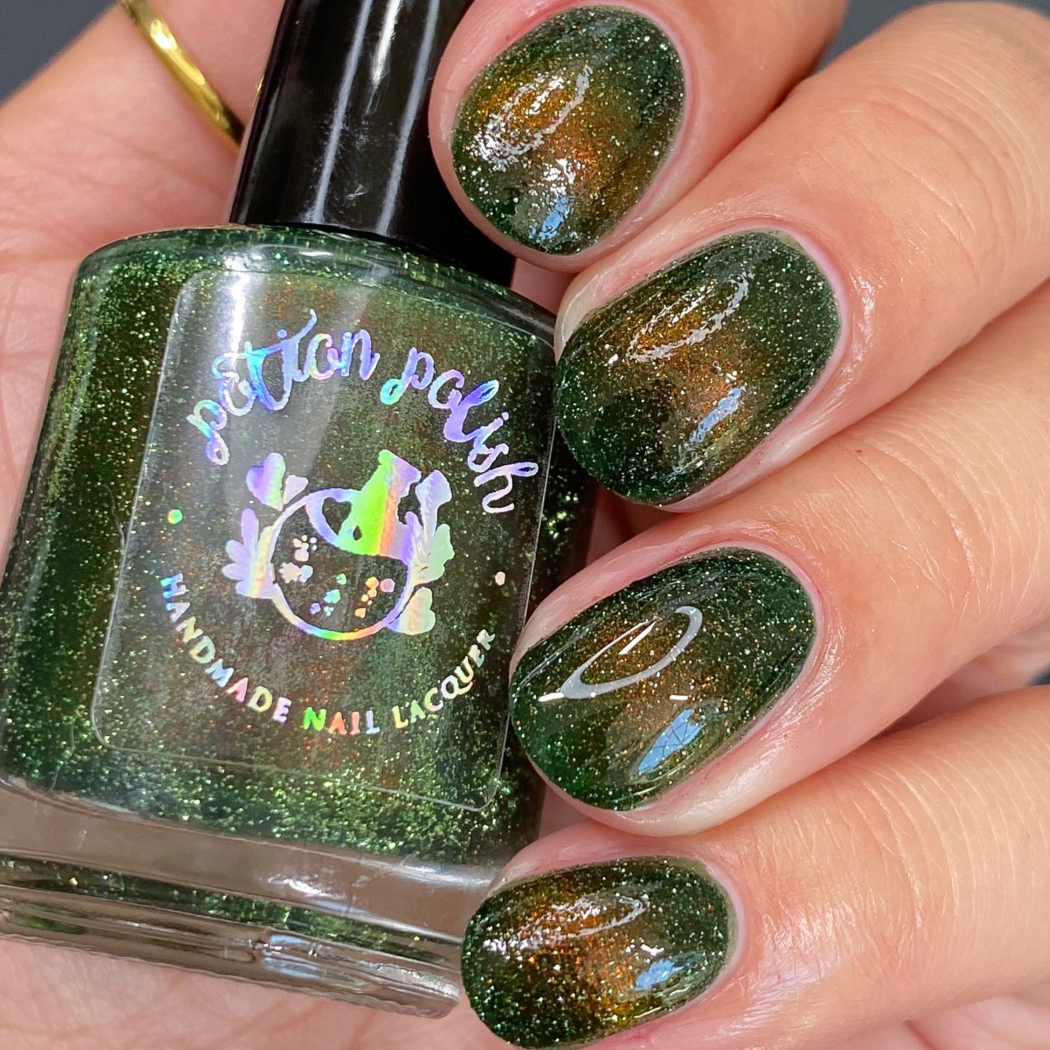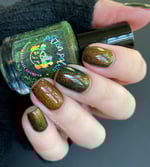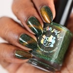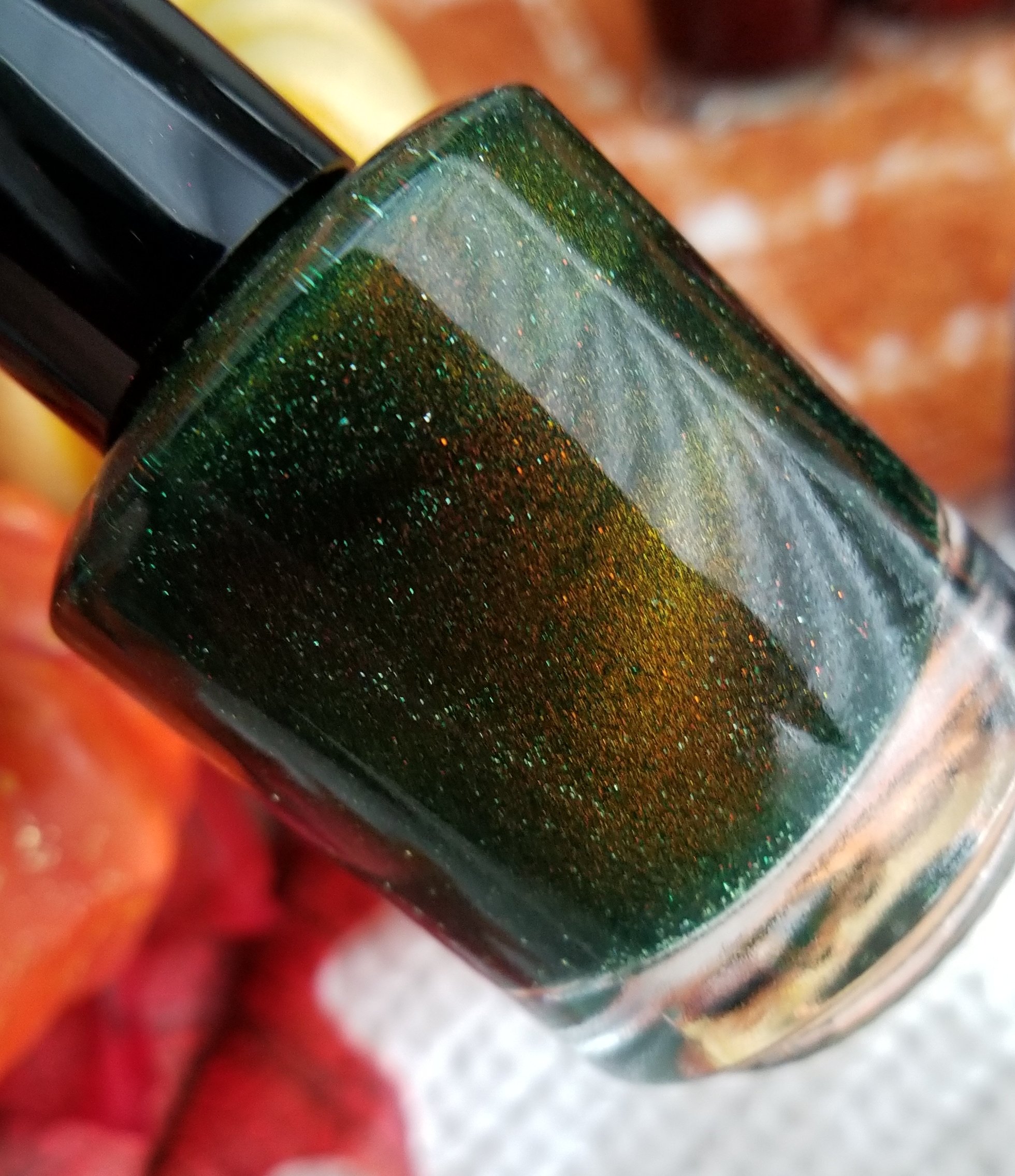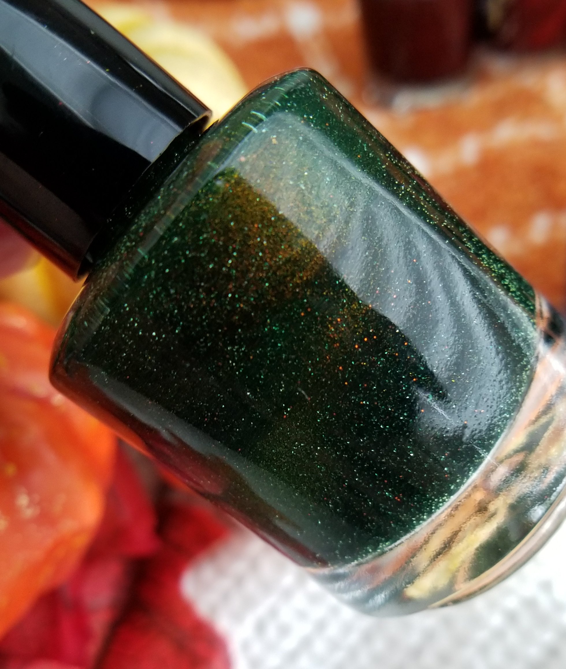 Greenwich Village is a deepened warm green with light green flash reflective micro glitter and orange/copper/gold magnetic shimmer. ** Polish is highly pigmented so just be sure to use base coat to prevent staining! **