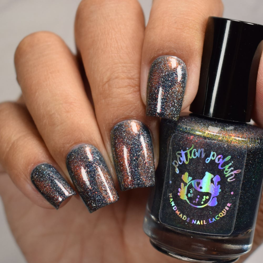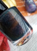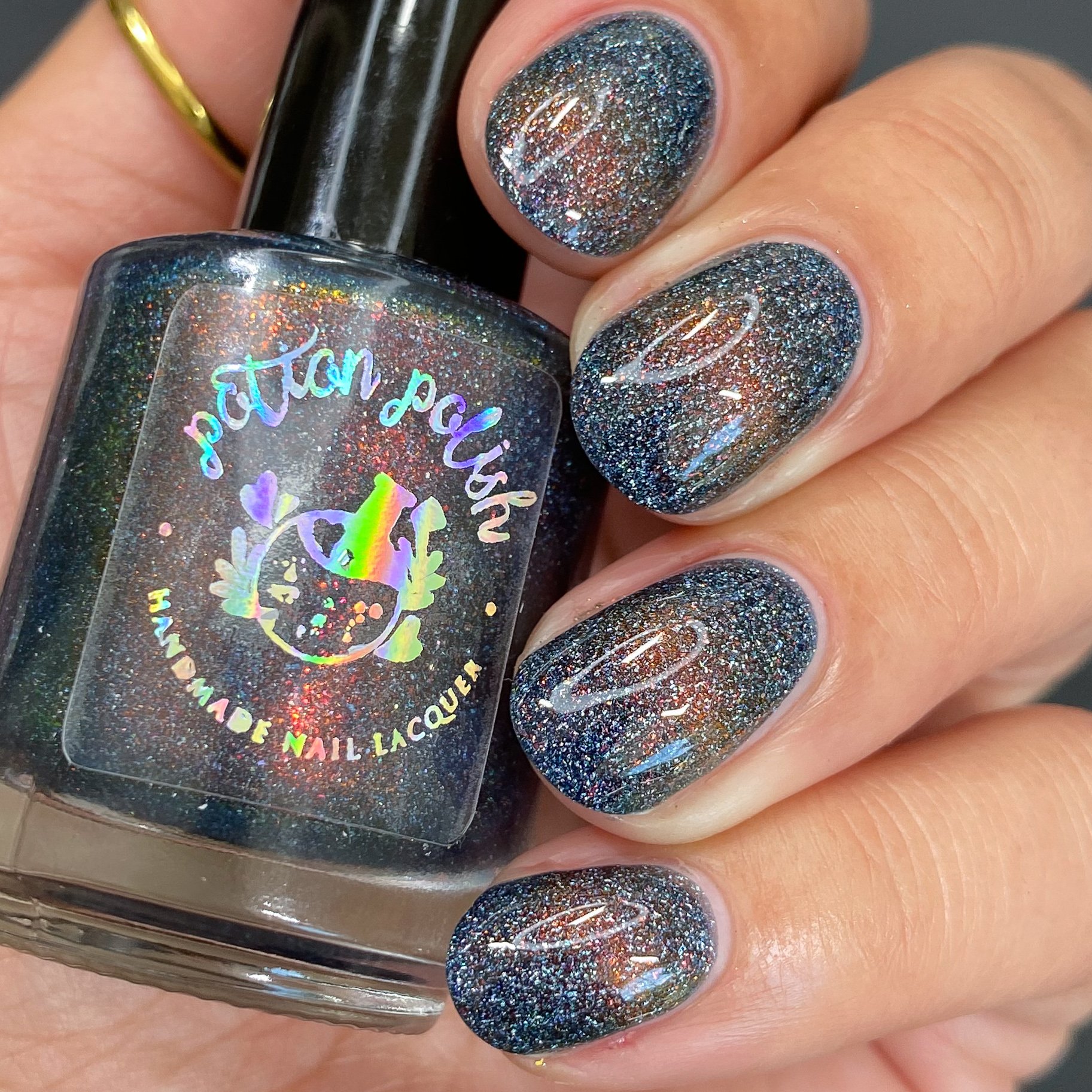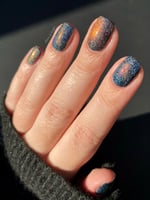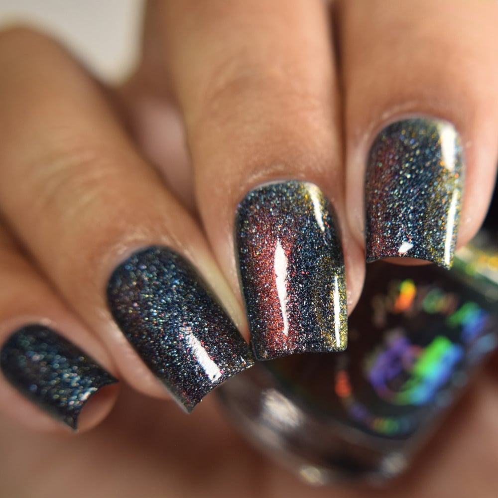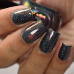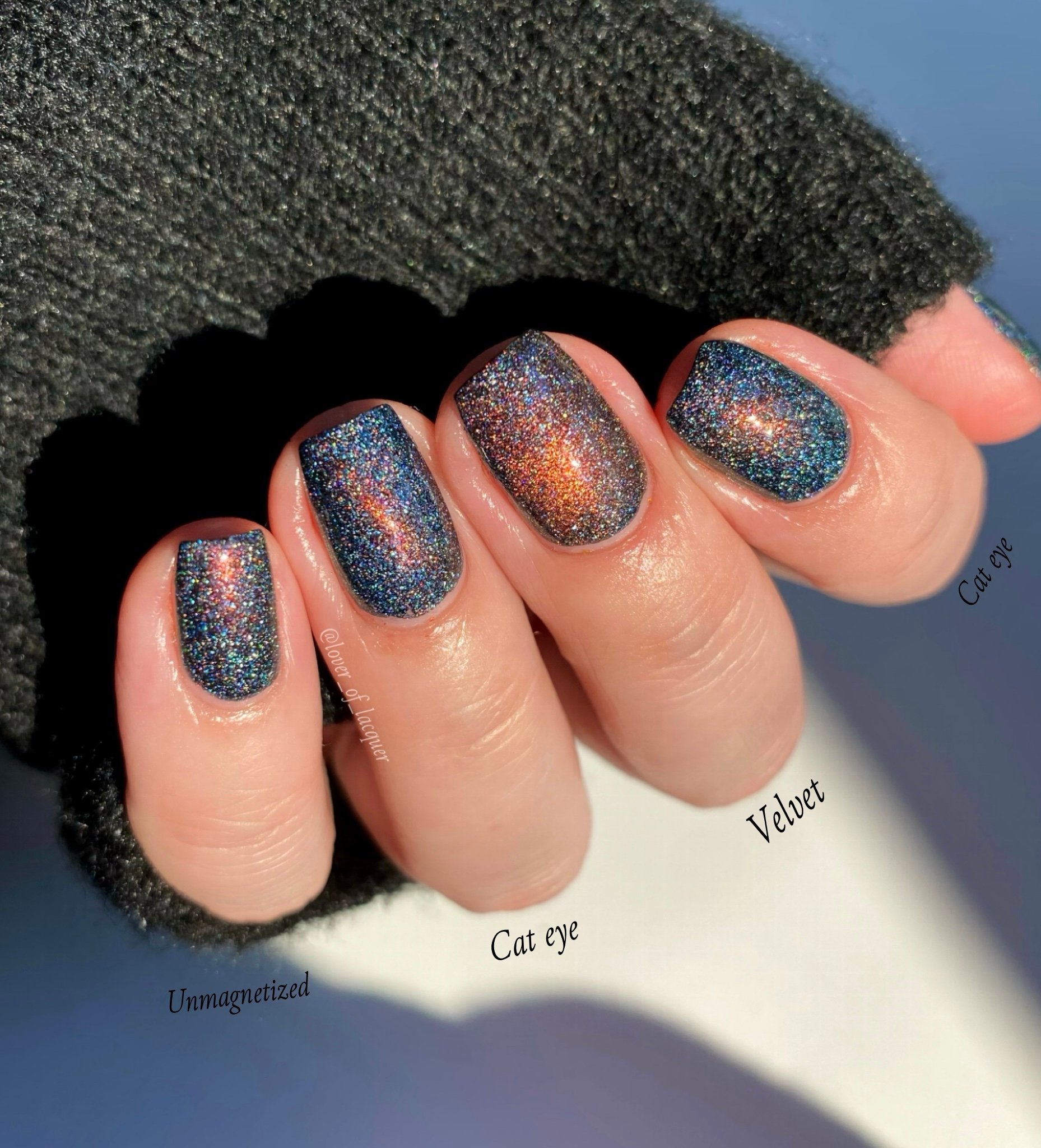November is a smoky blue gray holographic with red/copper/gold/green shifting magnetic shimmer and a touch of red/orange/gold micro flakes.