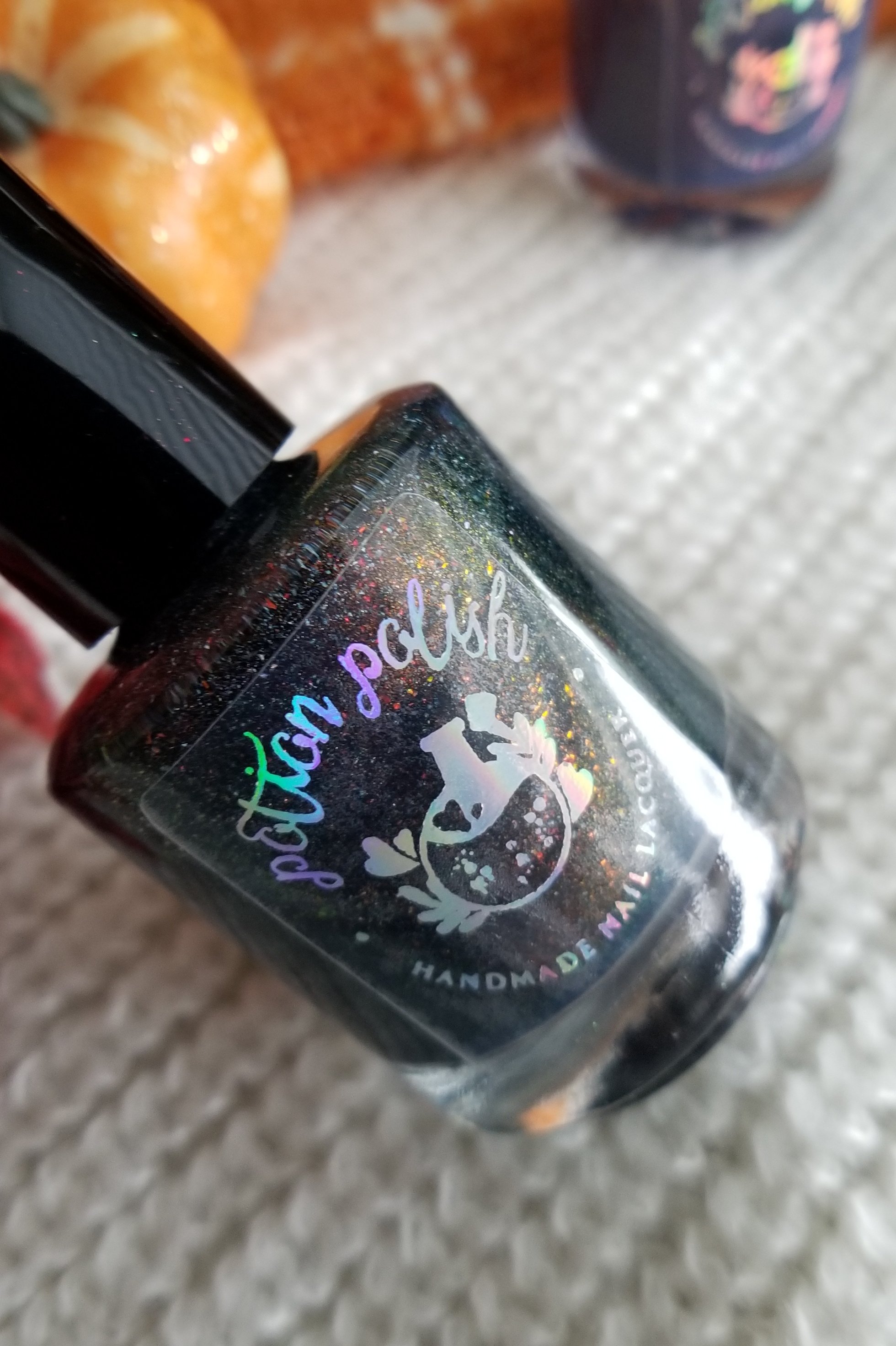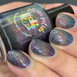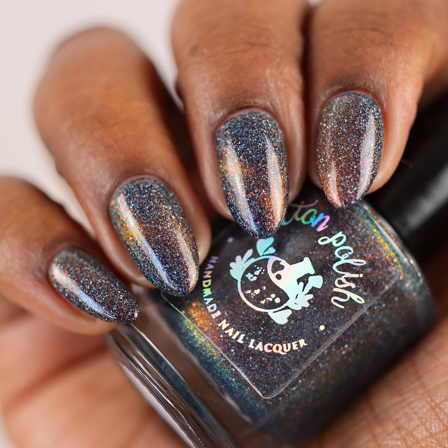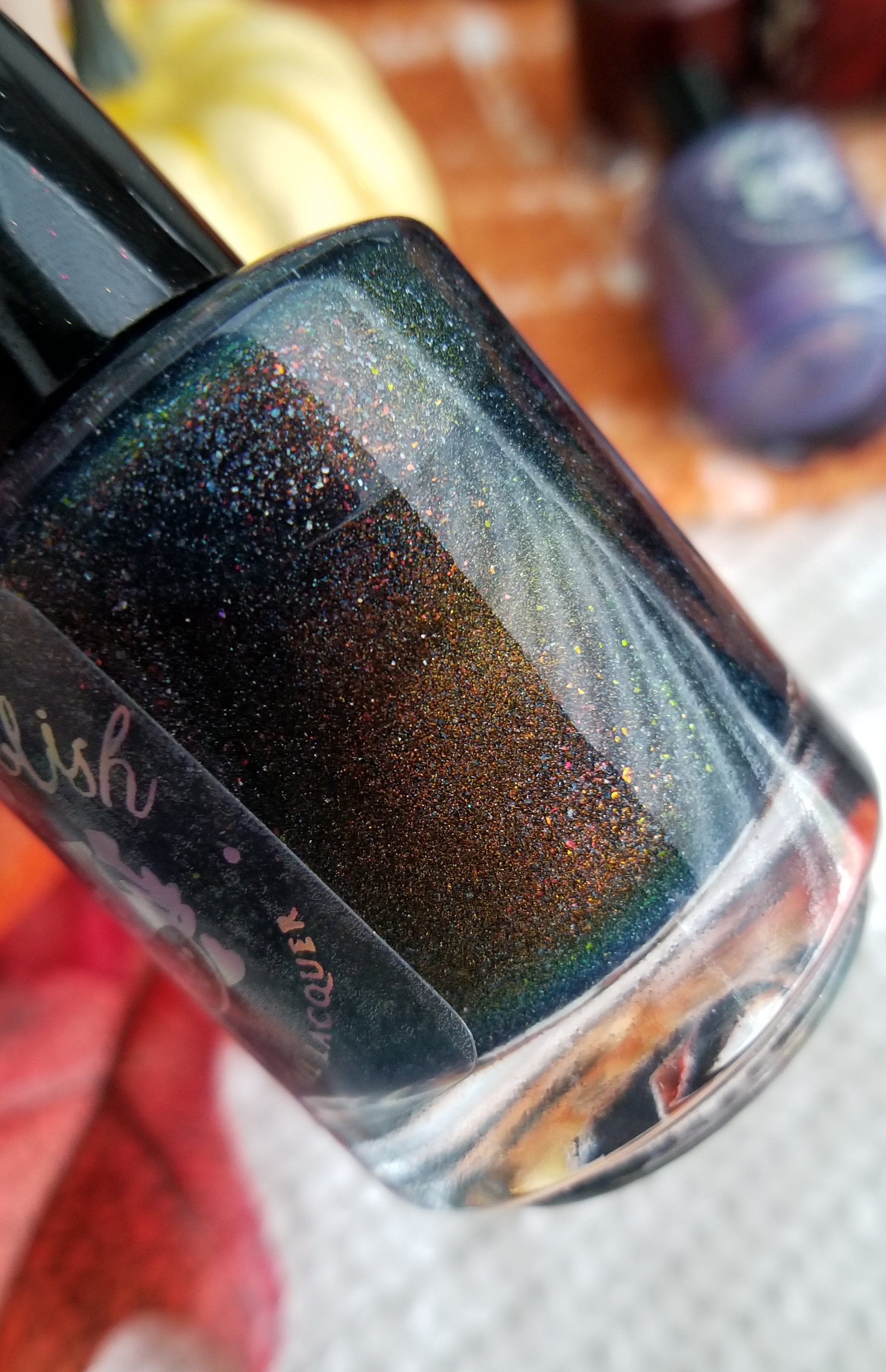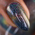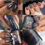 November is a smoky blue gray holographic with red/copper/gold/green shifting magnetic shimmer and a touch of red/orange/gold micro flakes.