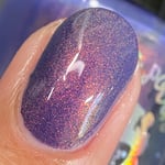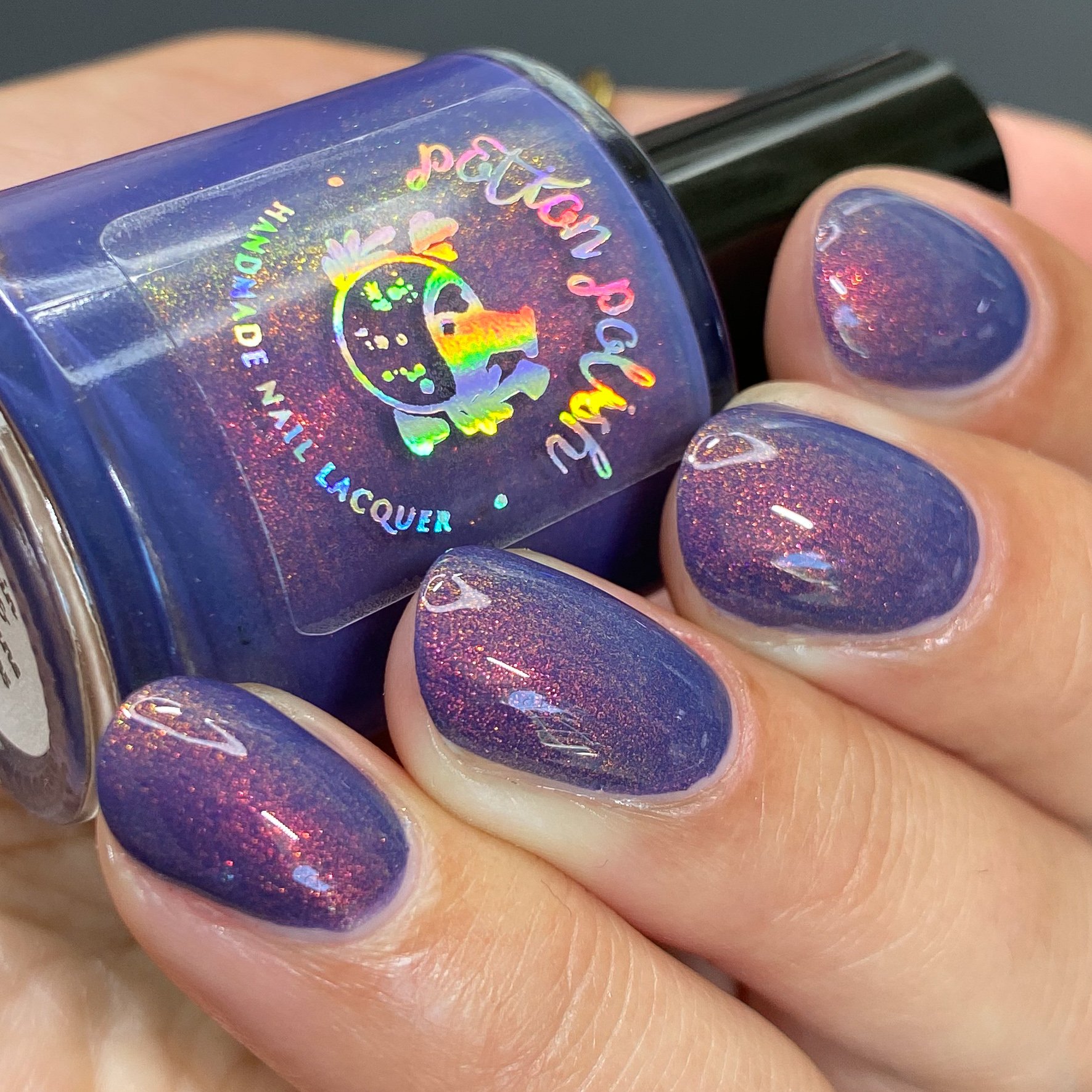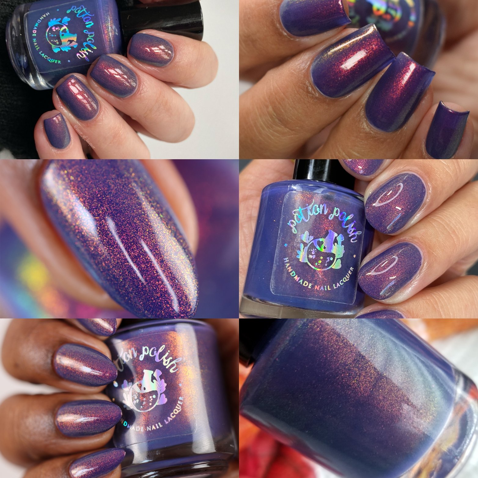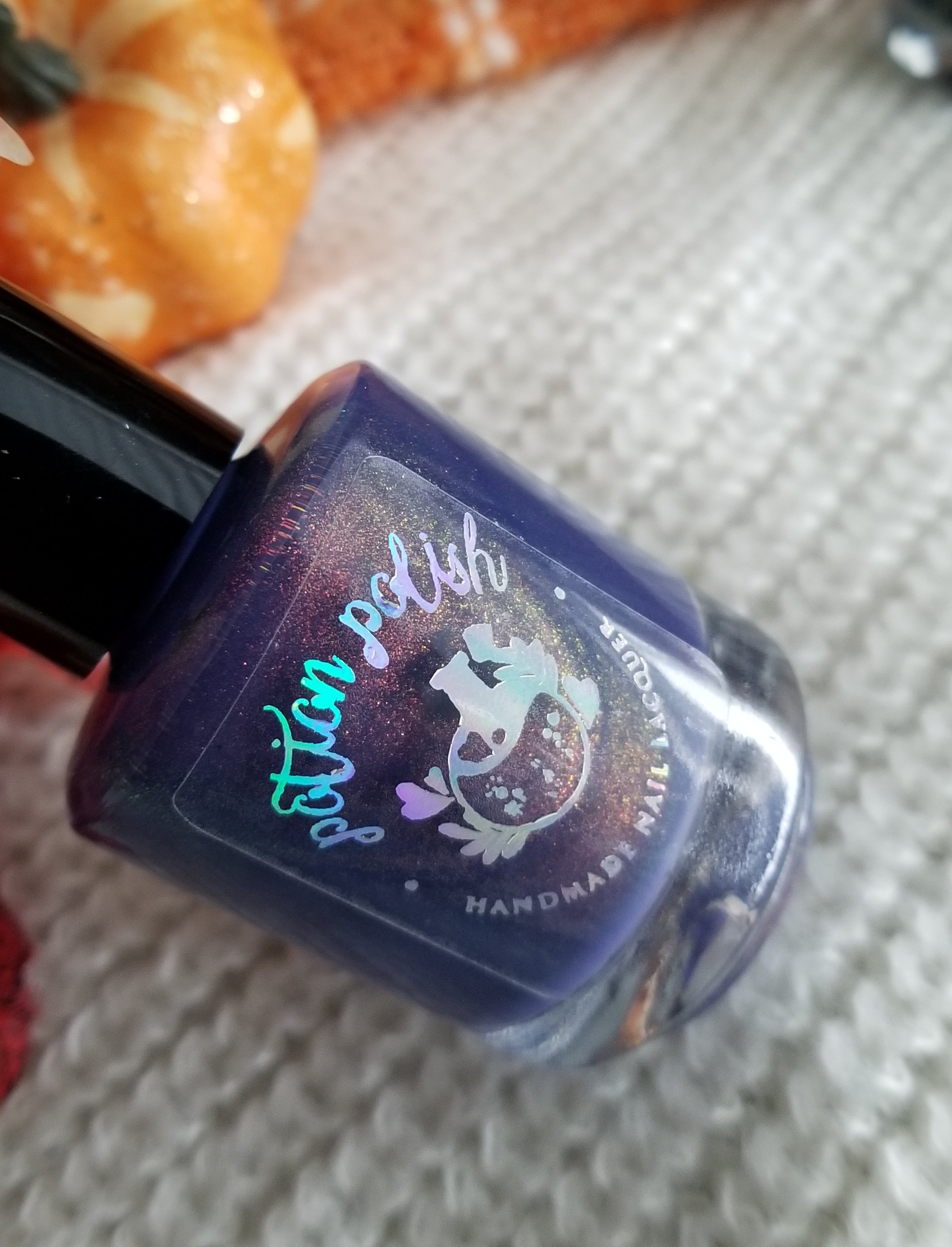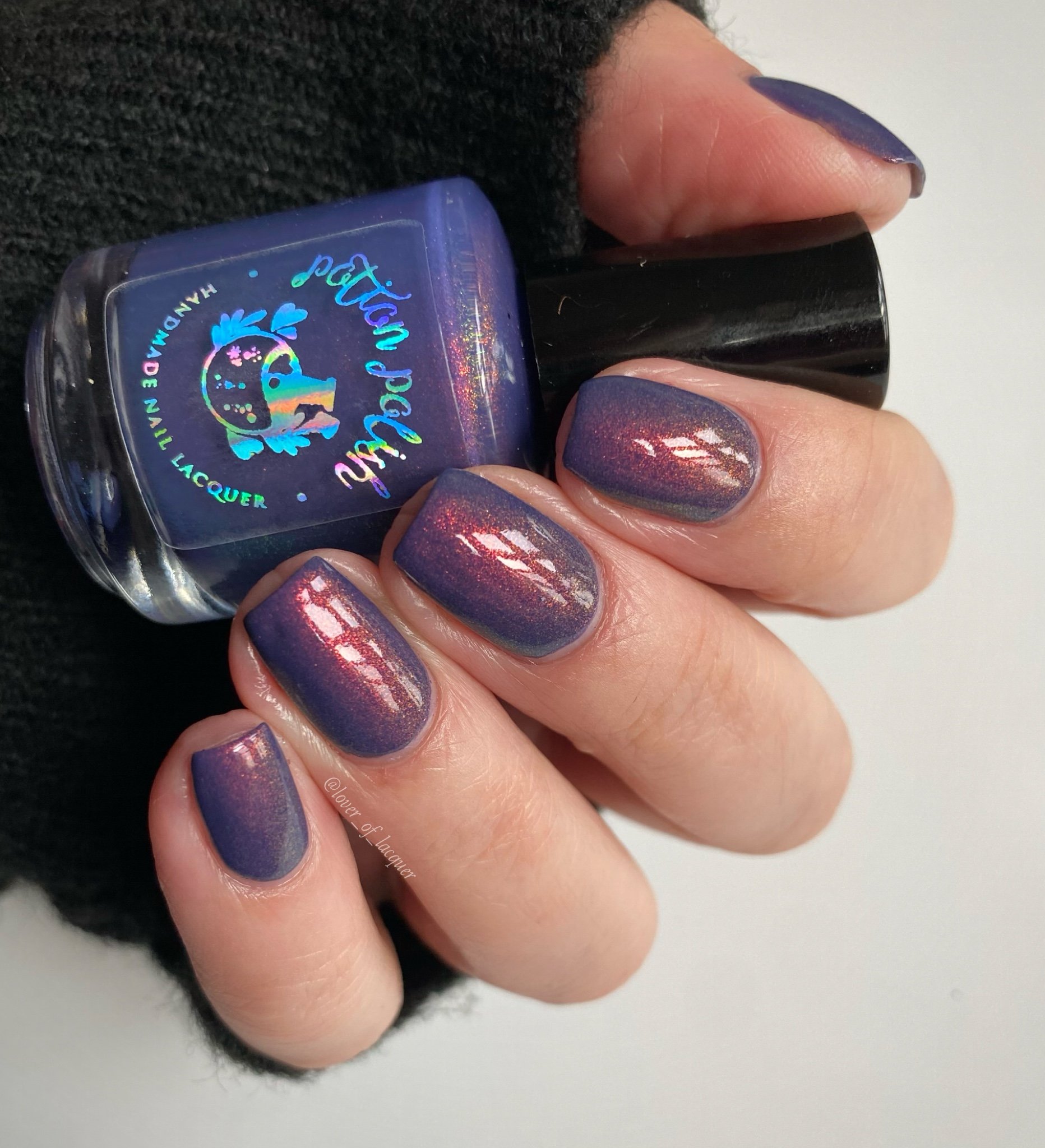 Pumpkin Spice & Mom Jeans is a dusty indigo blue crelly glowing with a red/pink/copper/gold/green shifting shimmer.