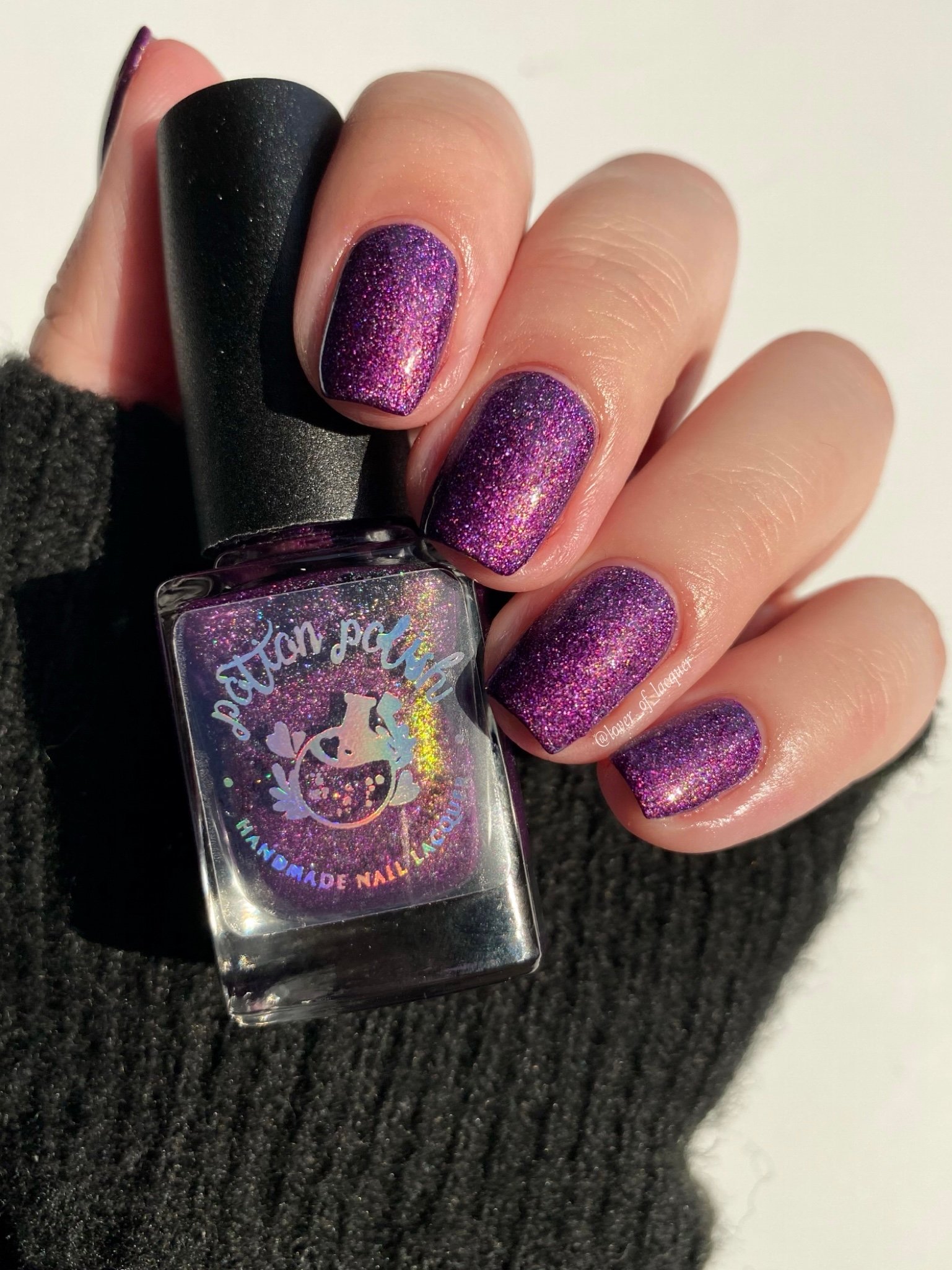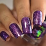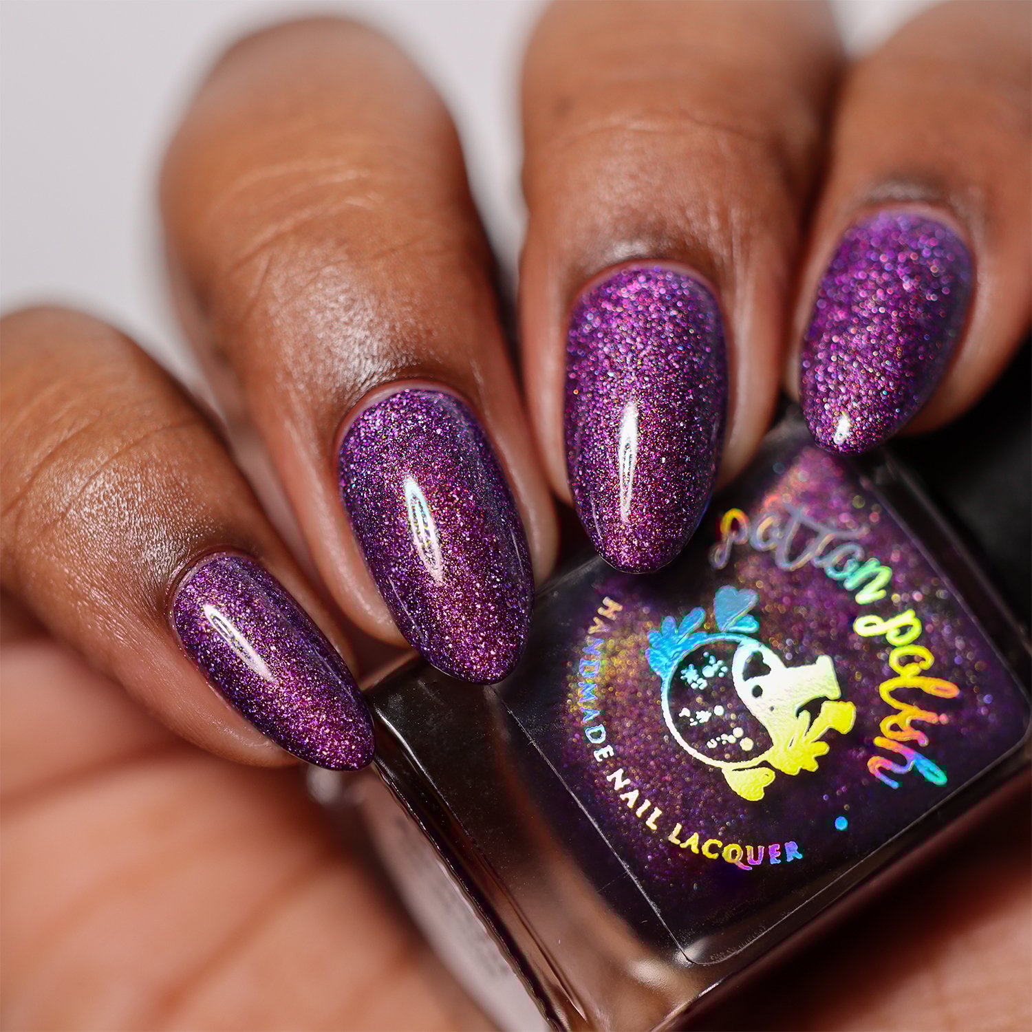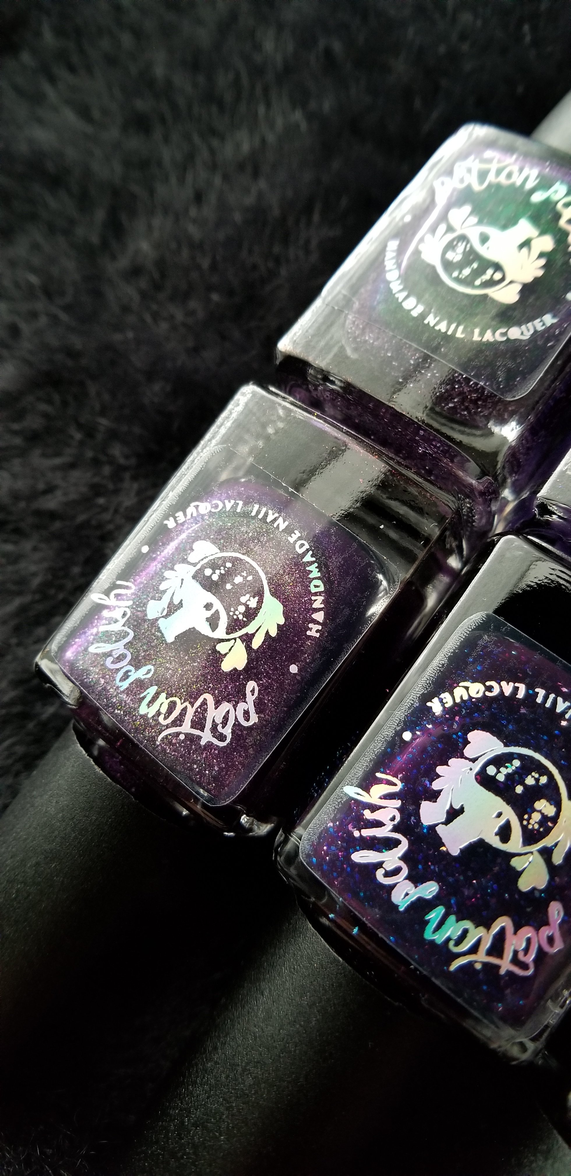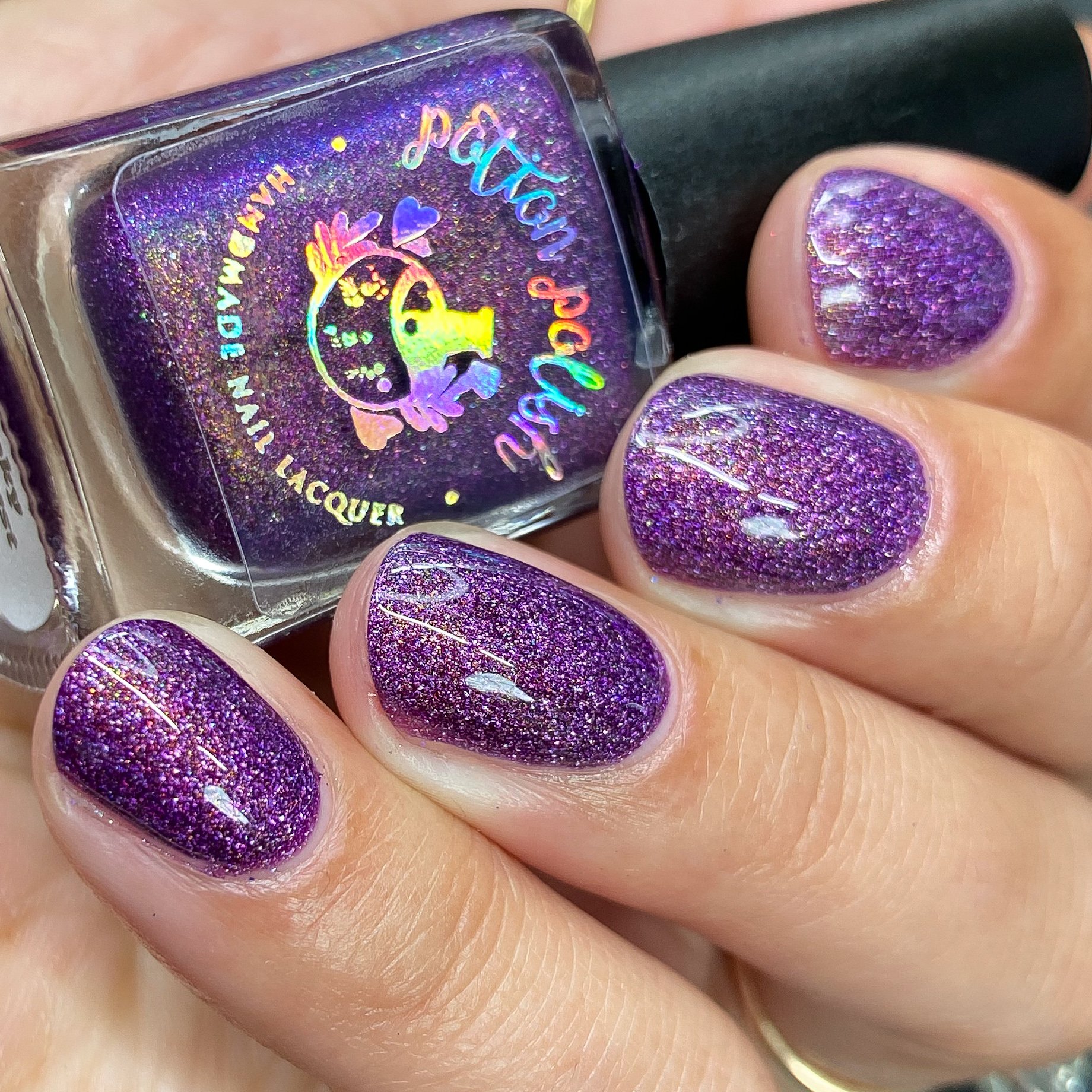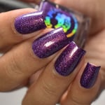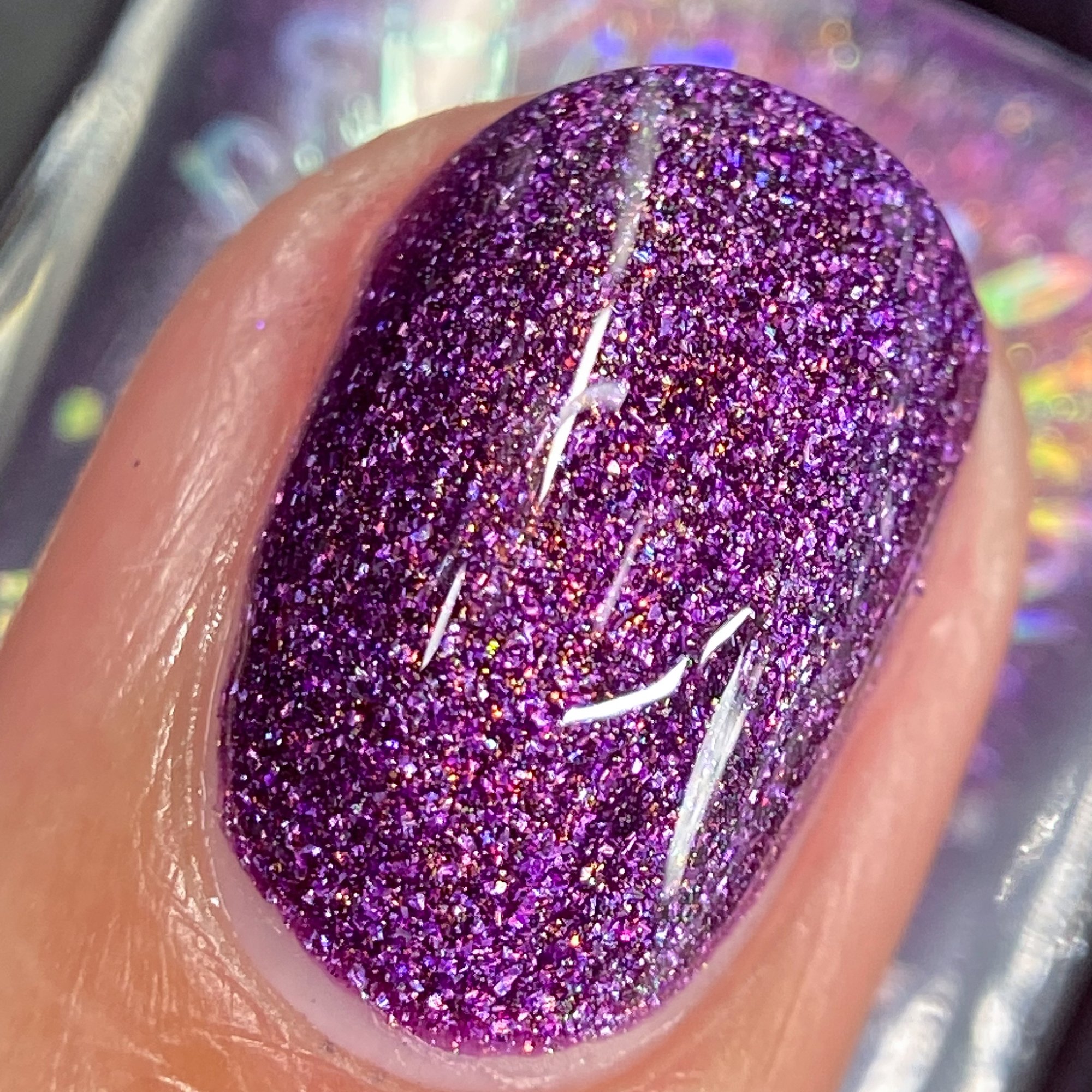 Smoky Amethyst is a smoky amethyst purple base packed with holo flakes and coppery gold to green to teal shifting shimmer.